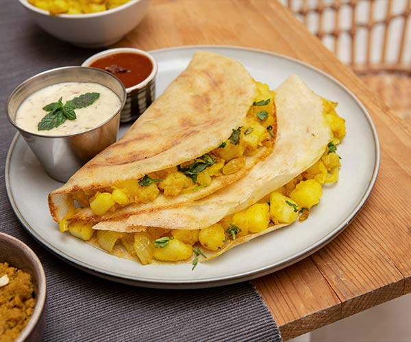 Dosa are the delicious fermented lentil and rice crepes that are soft yet crispy. You can feel the vibrant flavours of lentil and rice in your mouth as you bite into the crunchiness and softness.